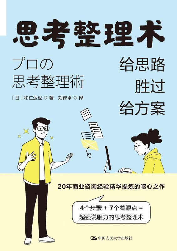 思考整理术是一种”不必给出解决方案,却能轻松消除对方的烦恼和困惑”的全新沟通方法。只需帮助对方厘清混乱的思维,对方就会迅速对你敞开心扉。该方法所做的并不是解决问题,而是引导和梳理对方的思路。通过思维整理,对方能察觉到之前未能察觉的问题,也能意识到自己真正想要做的事。思考整理术的4个步骤:确定主题;了解现状;描绘理想;寻找条件。思考整理术的7个着眼点:对方是否意识到了自己的价值;是否陷入了思维贫瘠;视角的平衡;用数字表达;痛点在哪里;预测成本效益;信息量的不一致。