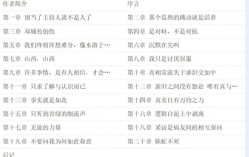 全书以关注新闻中的人为主线展开记叙了包括非典、虐猫事件、汶川地震、药家鑫案等事件。表达了作者本人作为一名记者最真实的经历和感受。